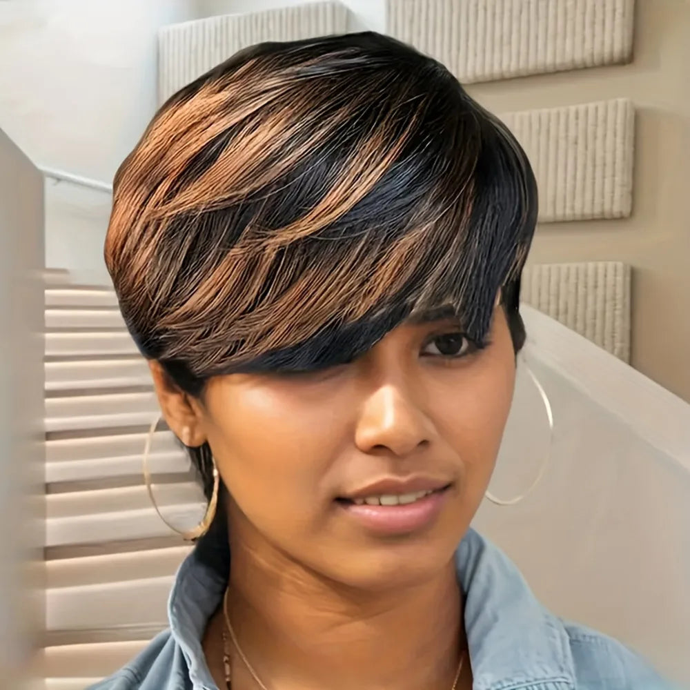 6inch 1b30 color machine made wig pixie wig pixie cut short straight human hair wigs 150% density remy hair for women